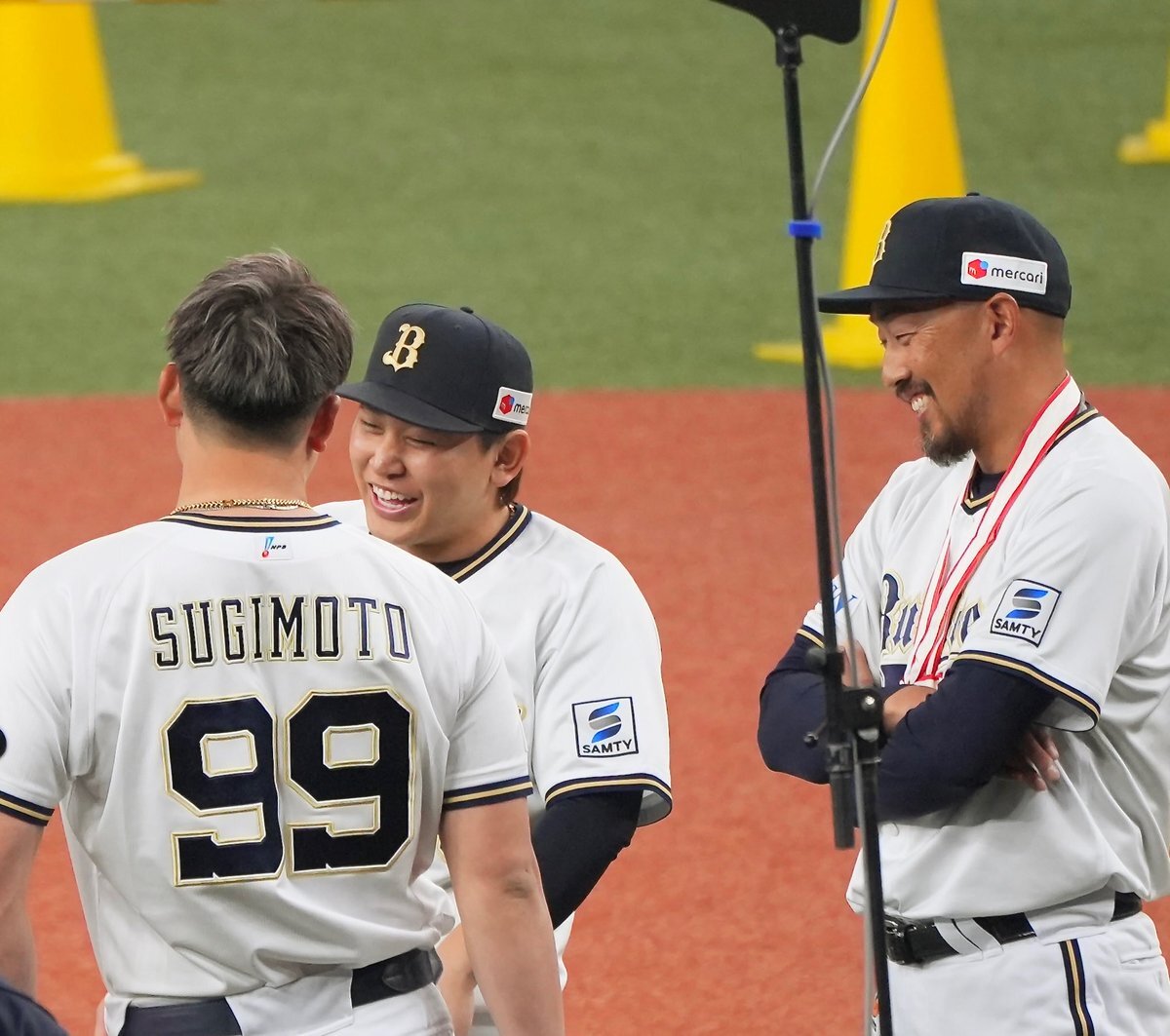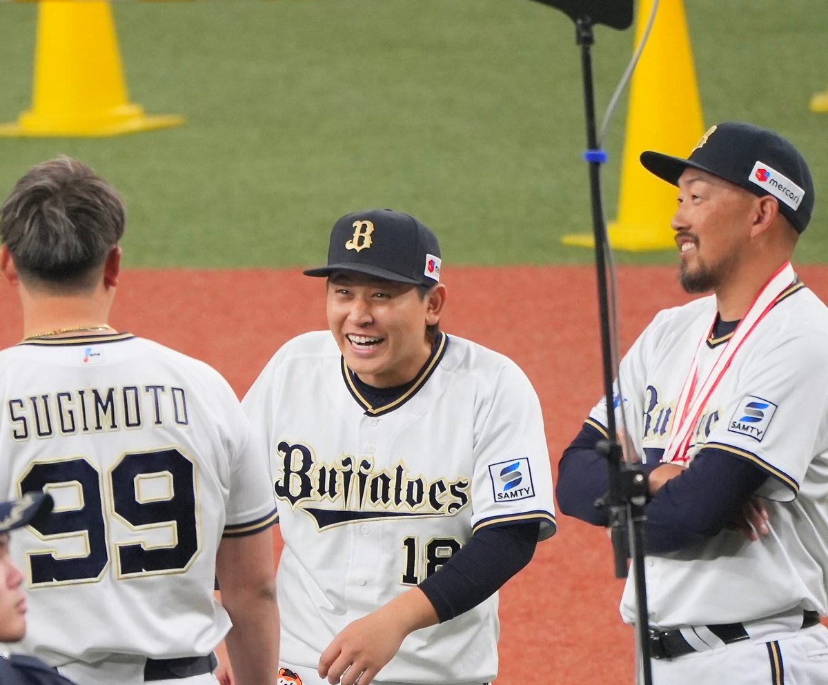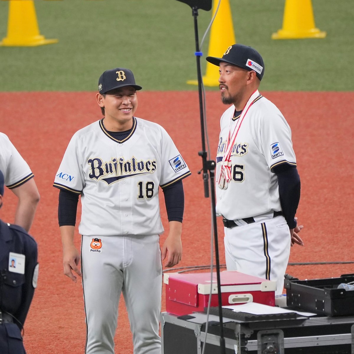 ラオウさんの話聞いて楽しそうな宮城くんと平野さん。幸 #宮城大弥 投手 #平野佳寿 投手 pic.x.com/niuepB1kvb