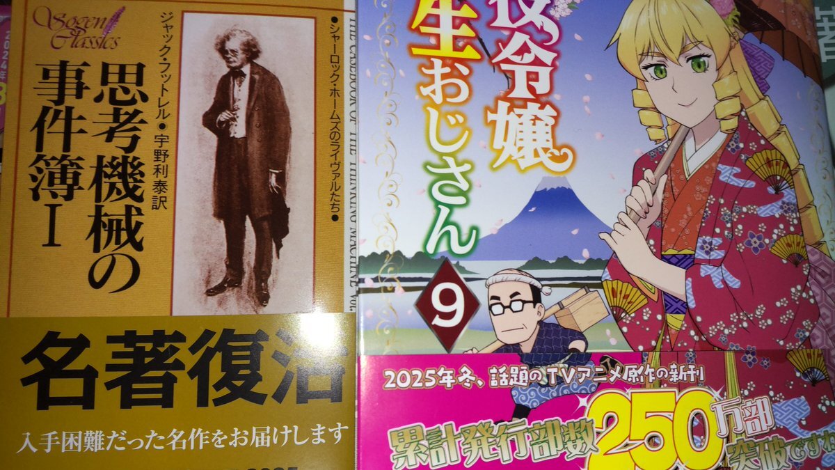 今日の戦利品 悪役令嬢転生おじさん第9巻アニメが終わっても原作の面白さは変わりありません重要な方々が現れてグレイス様の明日はどっち 思考機械の事件簿1巻 40年前に買ったんですが 復刊フェアという事で購入 夭折の天才ジャック・フットレルが生み出したシンキングマシンの活躍を楽しみます pic.x.com/pY6KqVWWhe