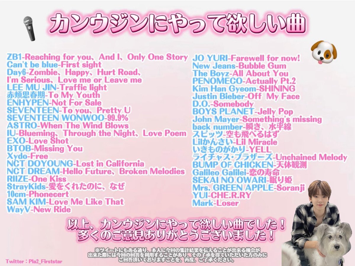 【💞カンアダン、カンウジンに好感のある皆様へ🍀】 お世話になっております!先日こちらのアカウントにて集計を行った、カンウジンにやって欲しい曲をまとめましたので、どうぞご覧下さい!👀🎀ིྀ 集計遅れまして大変申し訳ございませんでした🙇🏻‍♀️