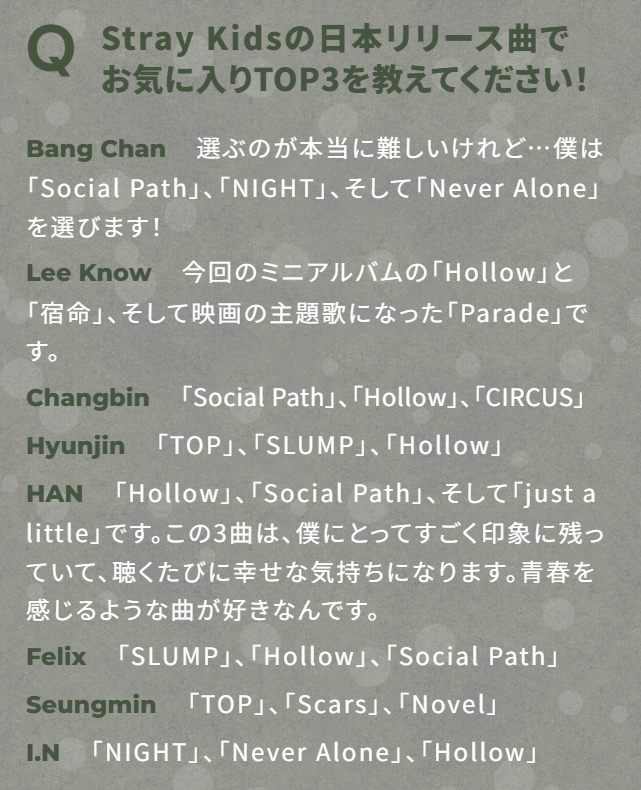 SKZ Top 3 picks of their Japanese songs 🐺Social Path, Night, Never Alone 🐰Hollow, 宿命 (Fate) , Parade 🐰🐷Social Path, Hollow, Circus 🥟Top, Slump, Hollow 🐿️Hollow, Social Path, just a little 🐣Slump, Hollow, Social Path 🐶Top, Scars, Novel 🦊Night, Never Alone, Hollow