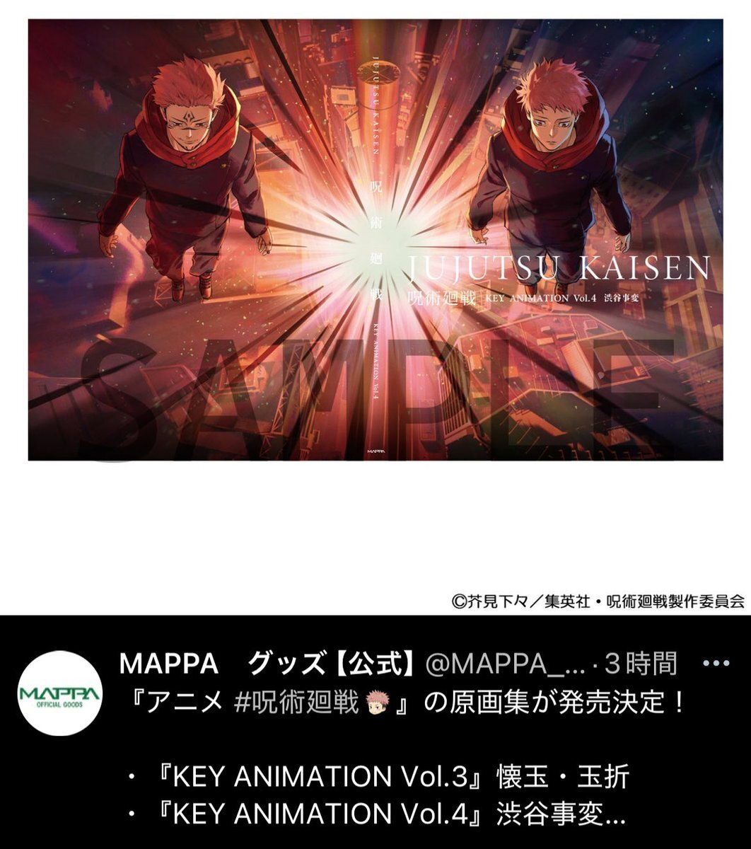 『アニメ #呪術廻戦』の原画集が発売決定! ・『KEY ANIMATION Vol.3』懐玉・玉折 ・『KEY ANIMATION Vol.4』渋谷事変 2冊同時発売が決定! MAPPA online shopにて只今より受注を開始! 2冊+オリジナル収納BOX付の特別版もございます。 ▼ご注文はこちら mappa-onlineshop.com/shop/default.a… #呪術廻戦