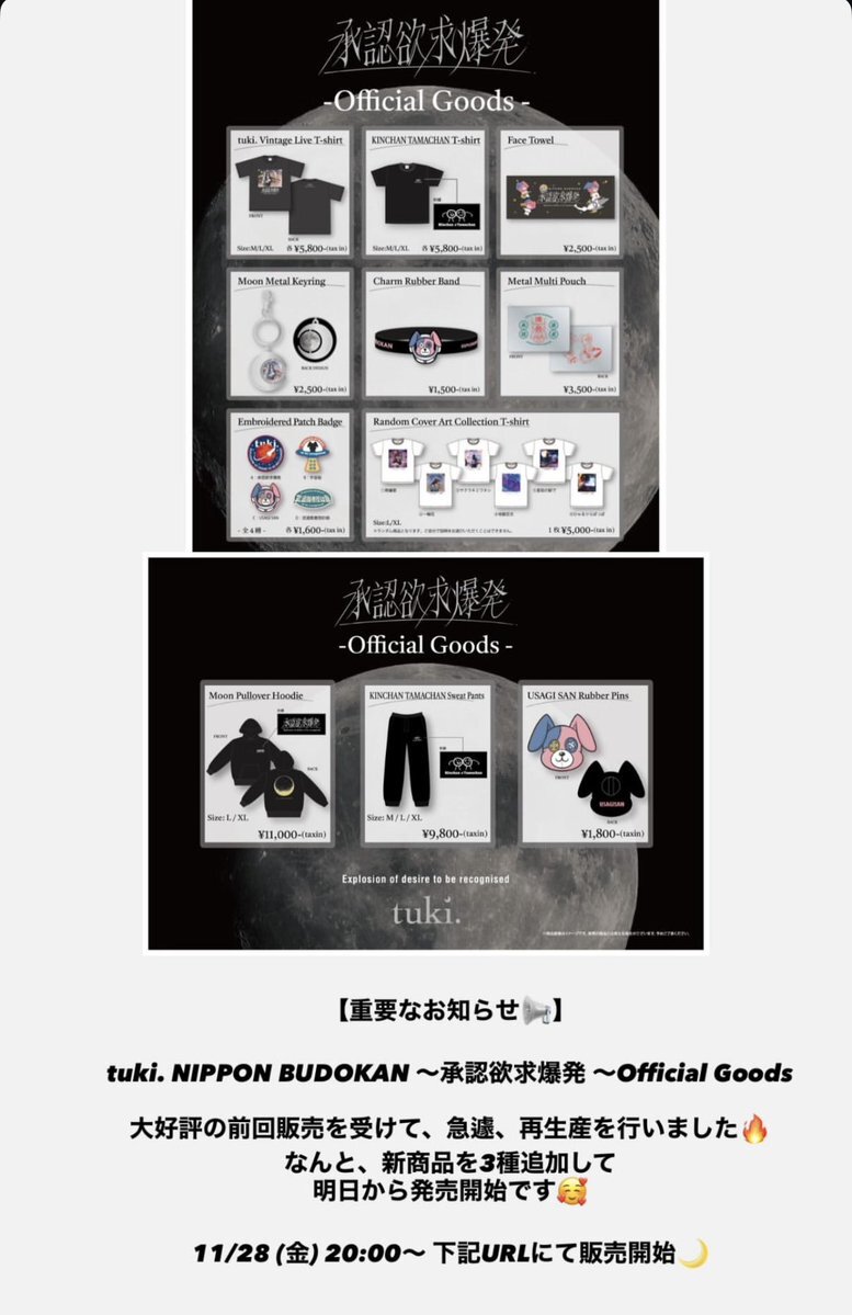 【重要なお知らせ📢】 tuki. NIPPON BUDOKAN 〜承認欲求爆発 〜Official Goods 大好評の前回販売を受けて、急遽、再生産を行いました🔥 なんと、新商品を3種追加して 明日から発売開始です🥰 11/28 (金) 20:00~ 下記URLにて販売開始🌙 👉 official-goods-store.jp/tuki/ #tuki #承認欲求爆発 #武道館 pic.x.com/0jVkoAhTYC