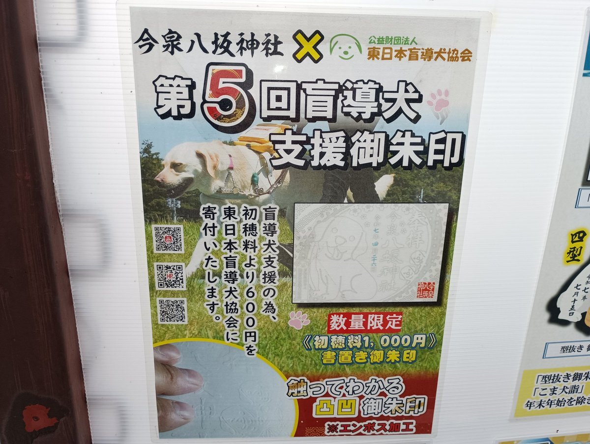 今泉八坂神社 (栃木県宇都宮市) 犬猫の可愛い御朱印多い中で宇都宮らしい黄ぶなと招き猫の日限定御朱印(直書き)と盲導犬支援御朱印にしました。 盲導犬支援はエンボス加工でほぼ見えない為ポスターを貼っておきました。 交通ステッカーはギャップがあり逆に良かったです #御朱印 #御朱印巡り pic.x.com/980qnzEqUK