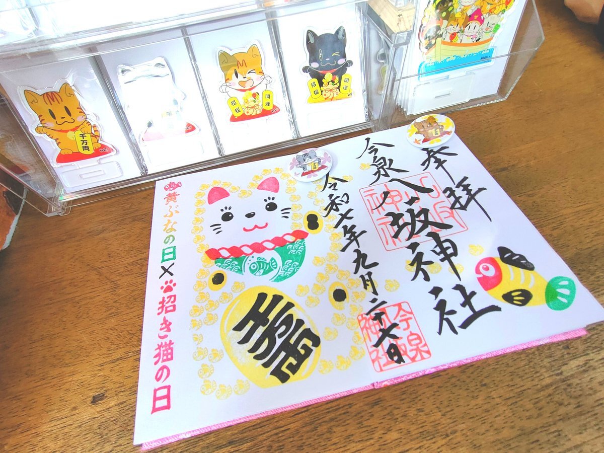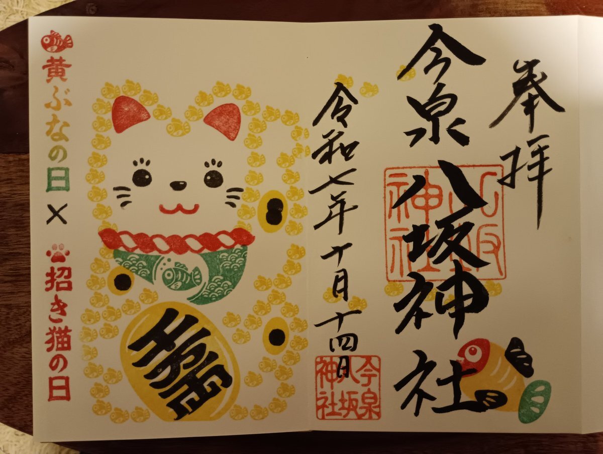☆今泉八坂神社  栃木県宇都宮市 先月 黄ぶなの日に参拝しました 9/27の黄ぶなの日と 9/29の招き猫の日を合わせた 御朱印を頂きました pic.x.com/GZl9fjzTLf