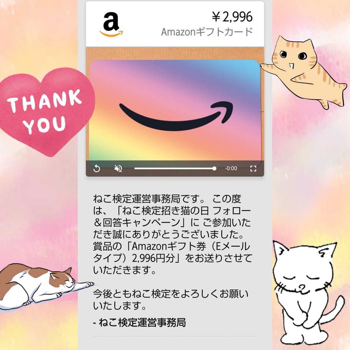 ねこ検定 様(@nekokentei)の招き猫の日CPに当選し、Amazonギフトを頂きました✨ 猫さん大好きなので嬉しいです☺️✨ 愛猫たちが喜ぶご飯やグッズを買ってあげたいと思います💕🐈️🐈️💕 ねこ検定も時間ができたら受けてみたいです🐾 この度はありがとうございました🐱 #ことりの当選記録 pic.x.com/RBmXvGRLcz
