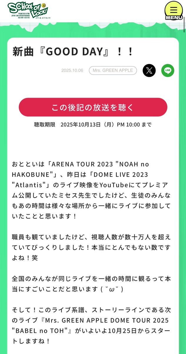 🍏#ミセスLOCKS 放送後記更新!📝 📢一時、WEBサイトが重くなってしまっていましたが、復旧しました💡お待たせしてしまってごめんなさい😔 今週は、ミセス先生の新曲『#𝑮𝑶𝑶𝑫𝑫𝑨𝒀』についての授業でした👍🏻🌼 🔻復習はこちらから!📄🎧 ✍🏻放送後記 🔗tfm.co.jp/lock/mrsgreena… 🎧radiko