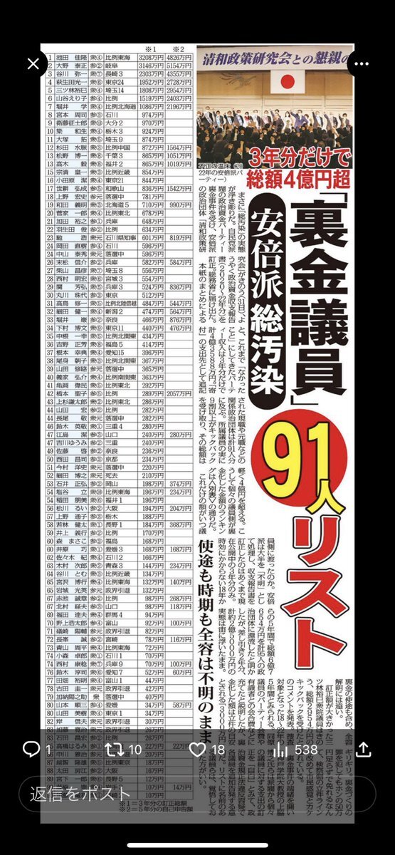 返信先:@takaichi_sanae国民の生活も安全も蔑ろで政治は国民のもの? 内政干渉し戦争煽っておいて何を言ってるの? 国民は軍拡化など望んでないのに軍事費の増加 国民は改憲など望んでいないのに改憲を推進 🏺🇺🇸の言いなりでは? またGrokによると、自民と維新の議員の統一教会の関与率や不祥事 犯罪率が国民の倍だそうですね