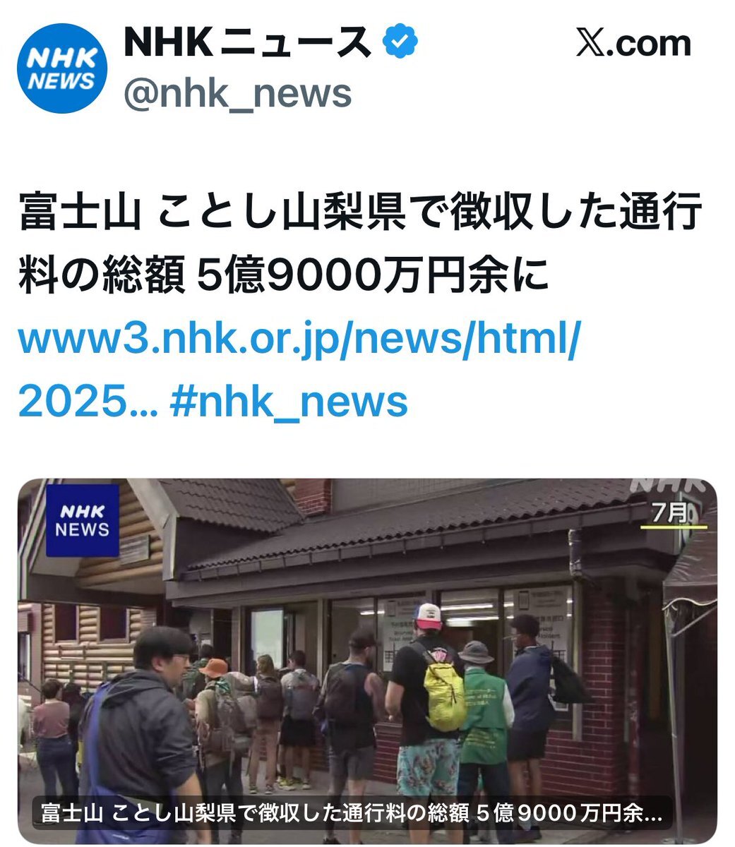 富士山のことしの夏山シーズンに山梨県が登山者から徴収した通行料は金額の引き上げに伴い、去年のおよそ2倍の5億9000万円余りにのぼりました。徴収した通行料は警備員の配置や避難施設の設置費用に充てるとしています。www3.nhk.or.jp/news/html/2025…