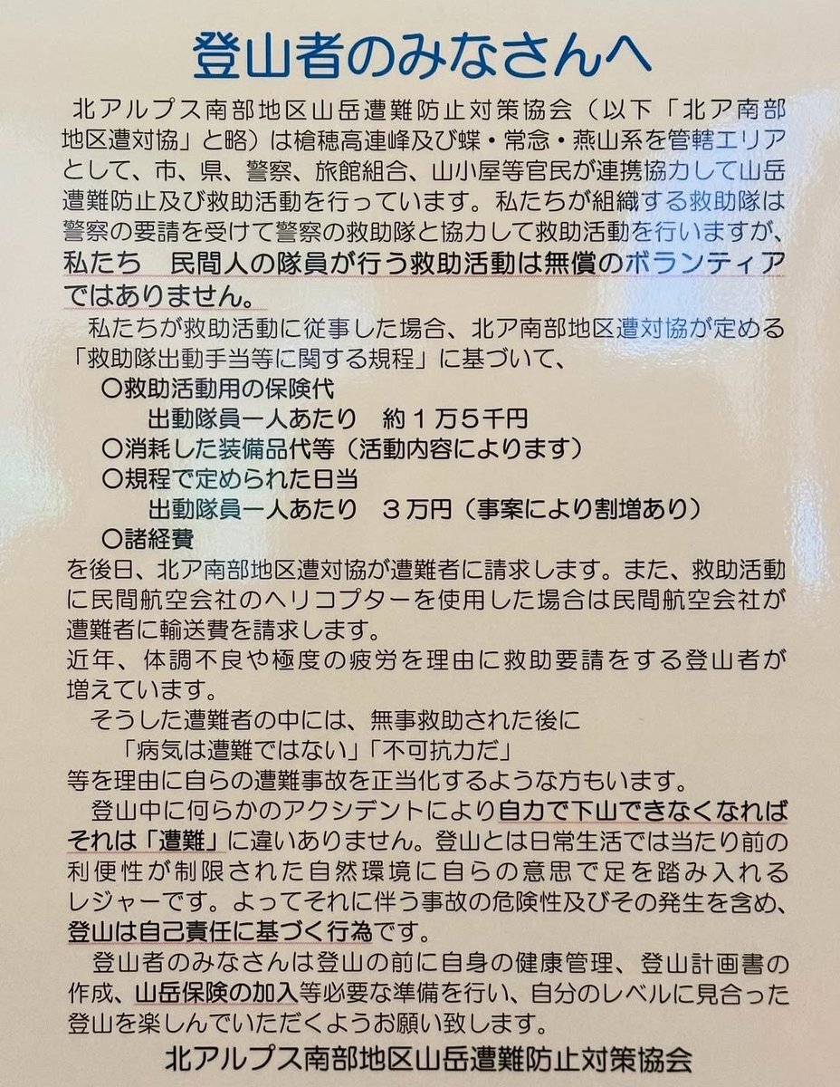■登山で遭難した場合の救助費用 ・隊員の保険代 1人あたり 15,000円 ・隊員の日当 1人あたり 30,000円 ・その他諸経費 ・民間ヘリコプターはプラス別費用 ・1日捜索で約30万、10人3日で150万 山岳保険は入っといたほうが安い。 pic.x.com/ufQI30vqtS