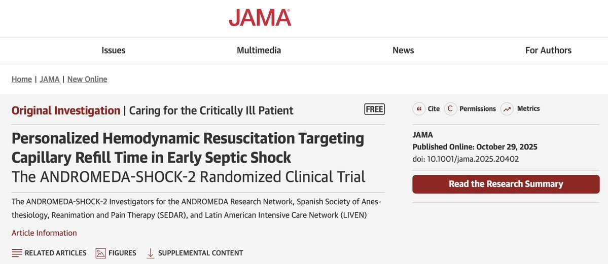 JAMAより,CRTを指標とした個別化蘇生プロトコルと転帰についての多施設RCT(ANDROMEDA-2). 19か国86施設のICUを対象に,敗血症性ショック患者(発症後4h以内)を2群に割付し調査. pic.x.com/s8XUlu4UwW