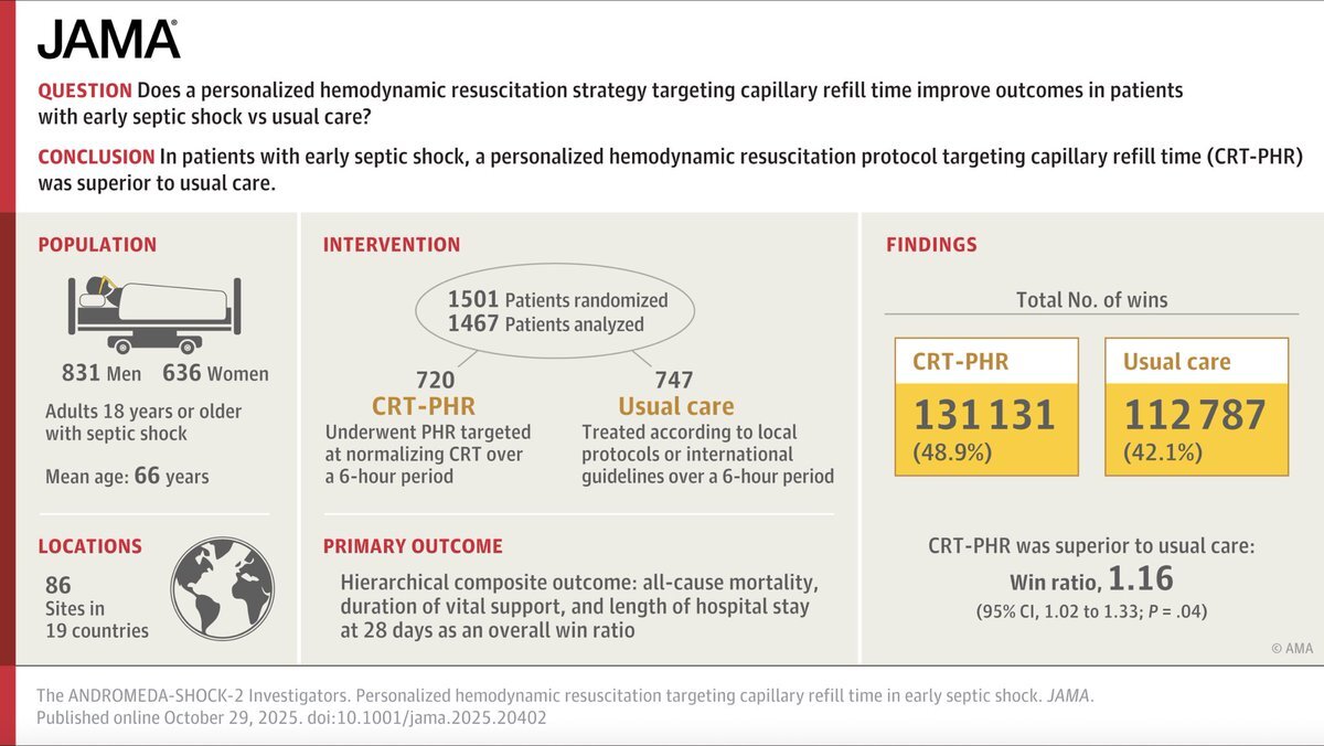 CRTを用いた個別化蘇生プロトコルの有用性 JAMA 2025/10/29掲載 ANDROMEDA-SHOCK-2試験 敗血症性ショックで CRT指標に基づく蘇生を通常治療と比較 🩸主要複合転帰 改善 勝率比1.16, p=0.04 死亡率は差なしだが、臓器サポート期間短縮 過剰輸液を抑え、蘇生終了点示す新たな指標に🤔? Fig 2注目 pic.x.com/nB8oWmxDdb