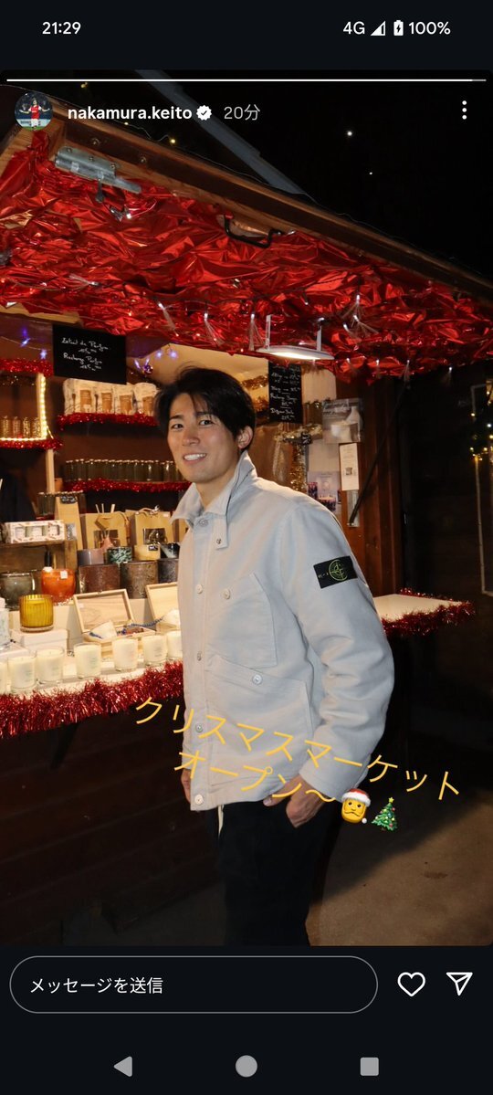 中村敬斗選手! クリスマスマーケットオープン! 私も行きたい!! もちろん中の服はクリスマスセーターですよね!✨️🎄😸🫵✨️