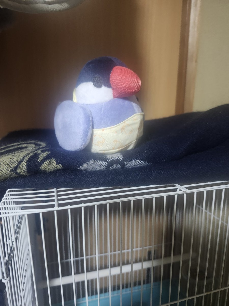 文鳥の日に頼んだひびぶんさん(@ginbato_poppo)のぬいぐるみ到着! しばらくはかごの上にいてもらおうかな ふわふわでフライトスーツもぴったりなよい子がきました! コレクションカードもシークレットで良いことづくし(*´▽`*) pic.x.com/wAkUTCOvOS
