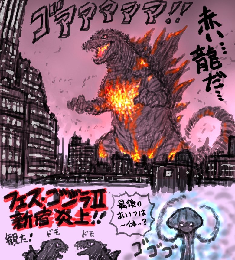 『フェス・ゴジラⅡ 新宿炎上』 短編の二次創作(公式だけど)としてクオリティが高けえ! 特に冒頭、自衛隊の攻撃をガンガン受けながらゲーム画面みたいにサイドビューで進んでいくカットがめちゃくちゃかっこよかった。 pic.x.com/N3KbdYKqY9