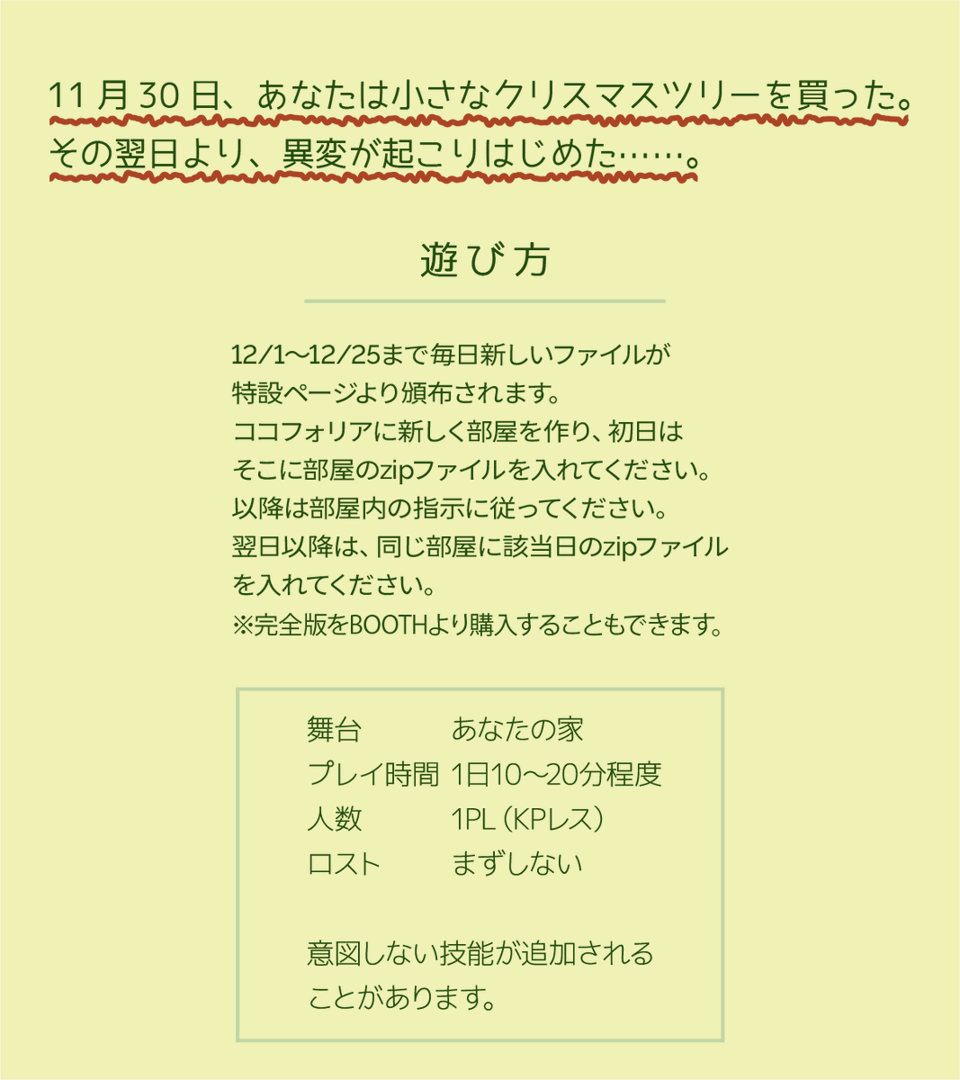 🌲クリスマスシナリオ企画🌲 12月1日より1日ずつ無料のココフォリア部屋が解放! リアルタイムで皆とシナリオを楽しもう! 大好評シナリオ『アド・ベント』のアドベントカレンダー企画が新規ビジュアルで復刻! 今年は特設サイトで開催! 探索者の名前を登録して待とう! add-bent.vercel.app pic.x.com/EaWFs34RGp