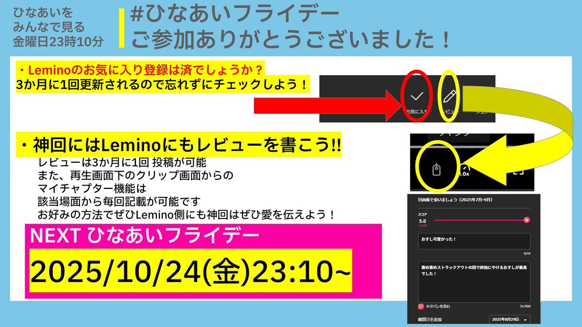#ひなあいフライデー ご参加ありがとうございました! ☆神回にはぜひ「レビューも書こう!」 📺Leminoプレミアム lemino.docomo.ne.jp/contents/Y3JpZ… 📺日向坂46パック lemino.docomo.ne.jp/contents/Y3JpZ… 次回は10月24日23時10分~ 来週も #日向坂で会いましょう をみんなで見よう~! pic.x.com/JDFBUx4jTz
