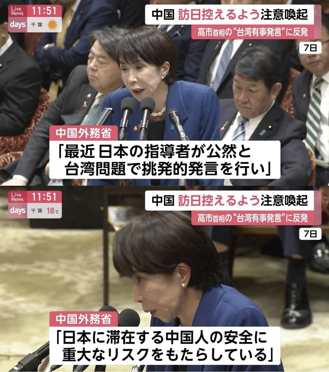 「日本の指導者が公然と台湾問題に関する露骨な挑発的発言を行ったことで、日本にいる中国国民の身体と安全に重大なリスクをもたらしている」と説明しました。 政府、日本への渡航避けるよう注意喚起(日テレNEWS NNN) #Yahooニュース news.yahoo.co.jp/articles/3e62e…