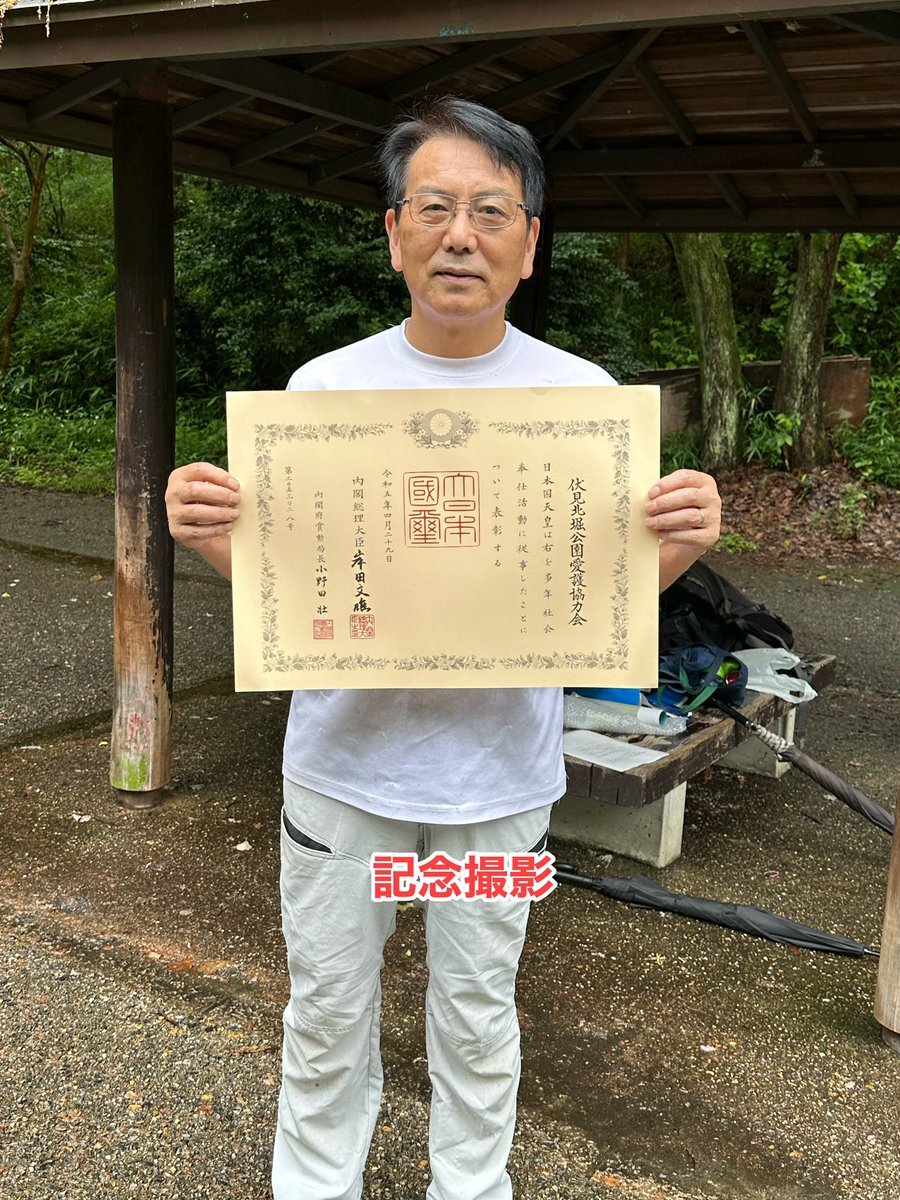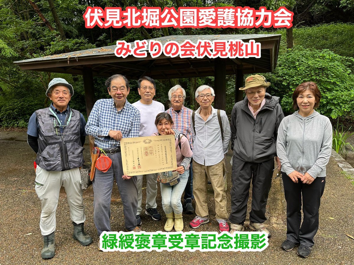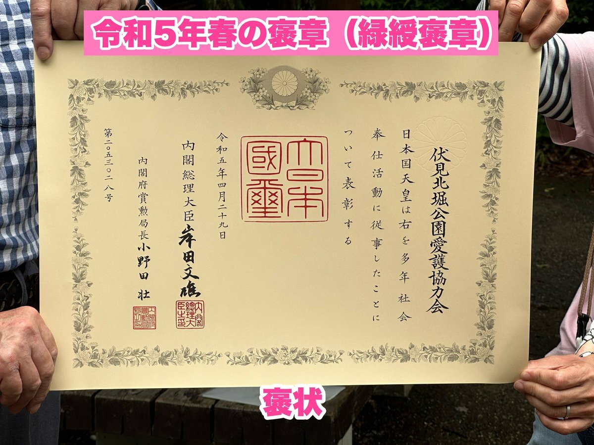 いつもの早朝ゴミ拾い散歩をしている、伏見北堀公園を23年間にわたり、社会奉仕活動が認められ、令和5年春の褒章『緑綬褒章』を内閣府から頂きました。 『伏見北堀公園愛護協力会』通称(みどりの会伏見桃山)宛に褒状が届き、メンバーで記念撮影🤗 身に余る光栄の褒章です🤗 #みどりの会伏見桃山 pic.x.com/477xP3v6JH