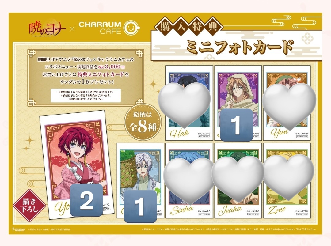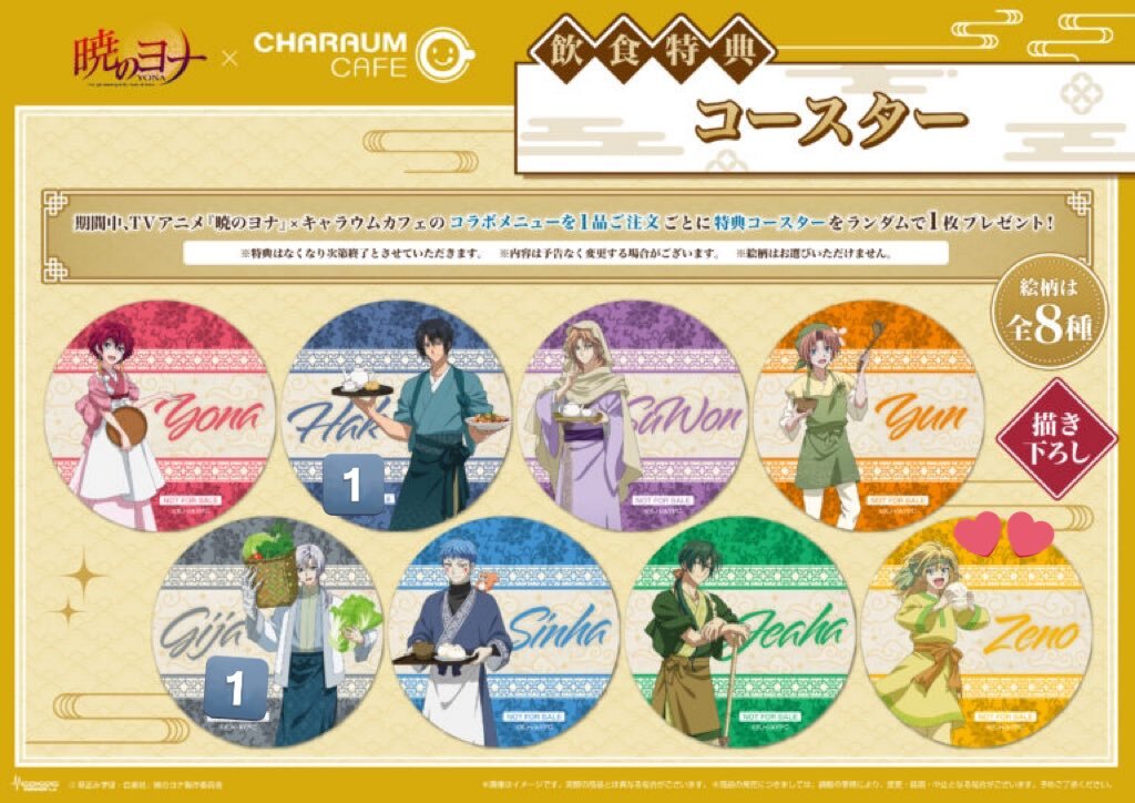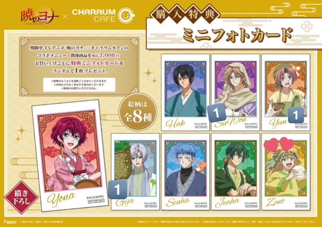 暁のヨナ キャラウムカフェ 特典 フォトカード コースター【交換】 譲)コースター→ハク・キジャ フォトカード→スウォン・キジャ・ユン 求)ゼノ 出先の為、ID付きの画像はございません。 郵送orツイフィ場所手渡し お気軽にお声掛け下さい! ※初回ツイフィ必読です。 pic.x.com/CCzSv6jgCz