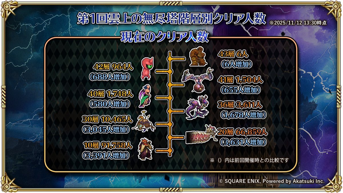 【👏自己ベスト更新者 続出!✨】 現在「第1回 雲上の無尽塔」復刻中! 11/12時点でのクリア状況を一部公開!📝 1層でも記録更新した人や、 クリアタイムを縮めた人は、 ぜひ感想や攻略パーティを教えてくださいね! 🗓️開催期間 〜11/22(土) 04:00 #ロマサガRS