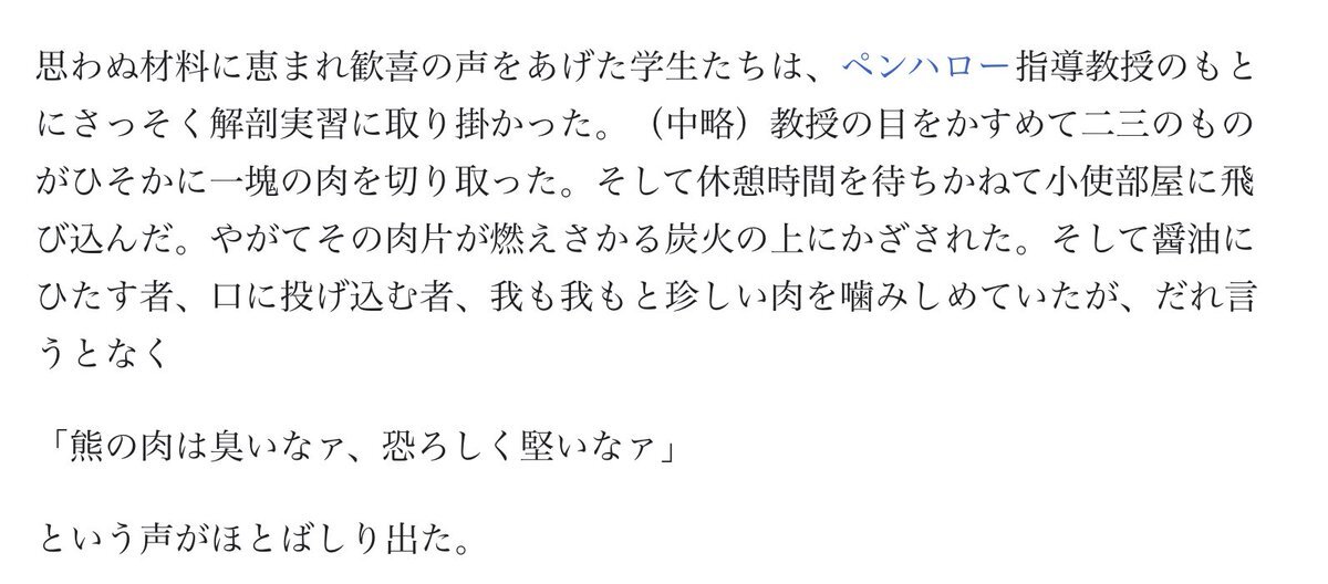 この事件、「解剖時に札幌農学校の学生たちがこっそりクマの肉片を焼いて食べたが、その後クマの胃袋を切り開くと消化途中の頭巾や赤子の手や髪の毛が出てきたものだから、学生たちは大慌てで口に指を差し込んでクマの肉を吐き出した。」という旨の記録があって戦慄した。新渡戸稲造も食べたのかな。 x.com/satoru_miyamot…