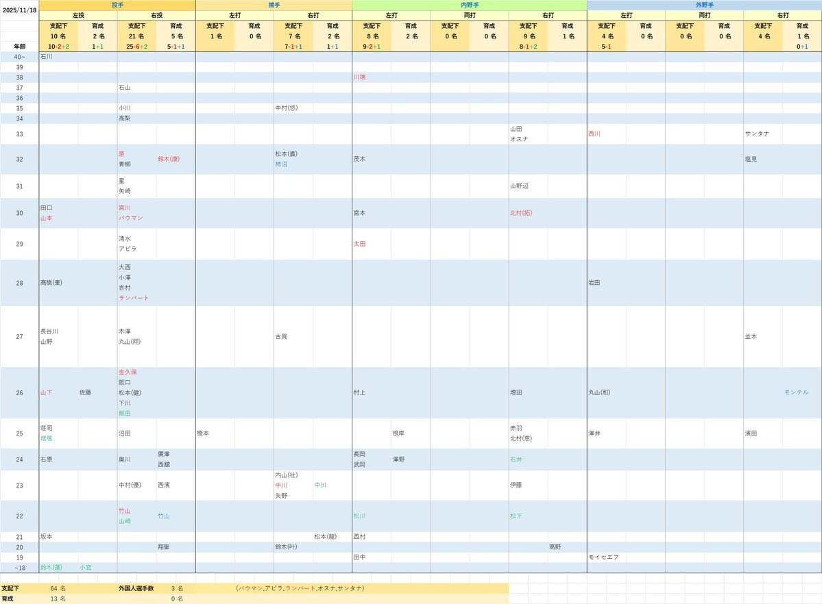 ヤクルト 柿沼友哉の入団とモンテルの入団(育成)を反映しました。 ※2選手の支配下/育成は報道から判断 支配下:64名(うち外国人選手3名) 育成:13名 ↓12球団分のまとめ posfie.com/@tefutefu_mome… pic.x.com/cdDTwxc9xv