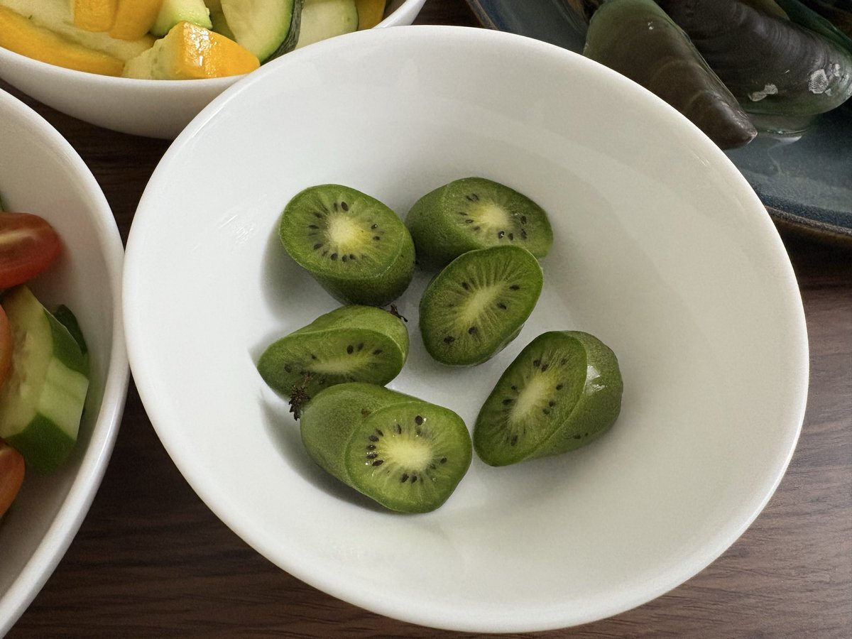 この時期だけの果実、サルナシ(学名:Actinidia arguta)です。「こくわ」とも呼ばれます。平安時代もこくわとされ、中国風に「獼猴桃」と書かれました。追熟させたので香り高くトロトロに甘いです。