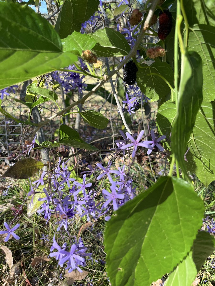 庭の片隅で咲く Queen’s wreath の鮮やかな紫💜に引き寄せられて写真を撮りに行ったら、葉っぱの間に桑の実を発見👀 まったく手入れしていないので、鳥🐦達の大好物になっていて、なかなか食べるチャンスがなかった😂 久しぶりに食べたら、美味しい😋 #羽生クラスタ植物部7thアニバーサリー 続き➡️ pic.x.com/GRh2Bk1Y3g