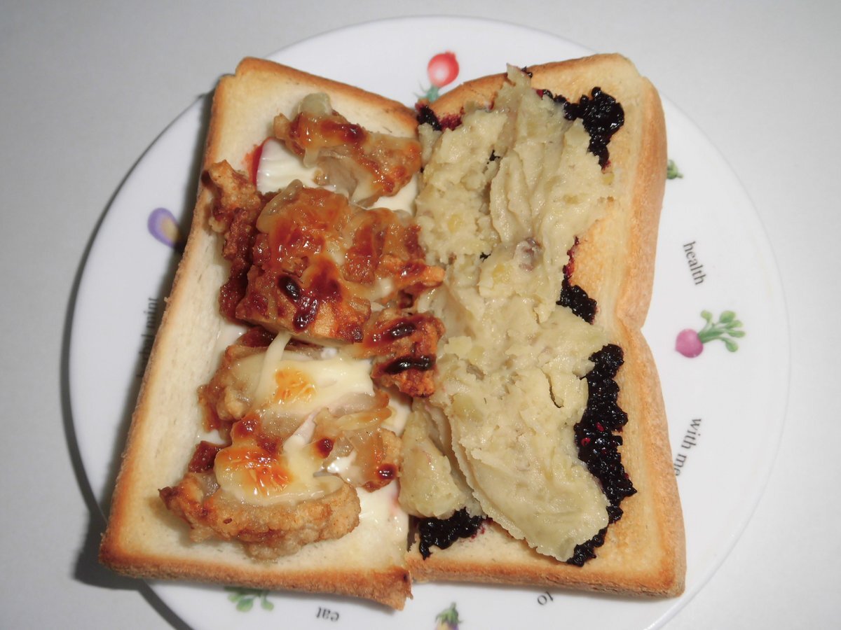 トースト。左はチーズチキンの残り物トースト、右は桑の実ジャムと栗ペースト。 pic.x.com/FofFU3ytZP