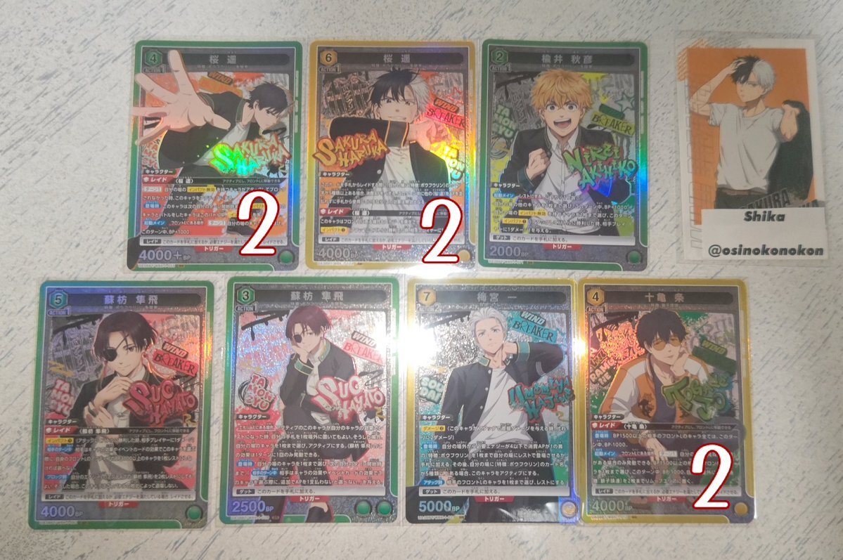 【交換】WINDBREAKER ウィンブレ ユニオン アリーナ ユニアリ トレカ [譲] SR桜、楡井、蘇枋、梅宮、十亀 (画像1枚目、数字は所持数) [求] 同種 SR杉下、梶、兎耳山 同種 SR☆、R☆、パラレル ☆、パラは複数提供可能。 (難しいと思うのでゆる募集) 他ポストとの交換⭕️ お気軽にお声がけ下さい。 pic.x.com/bafAFEhOFs