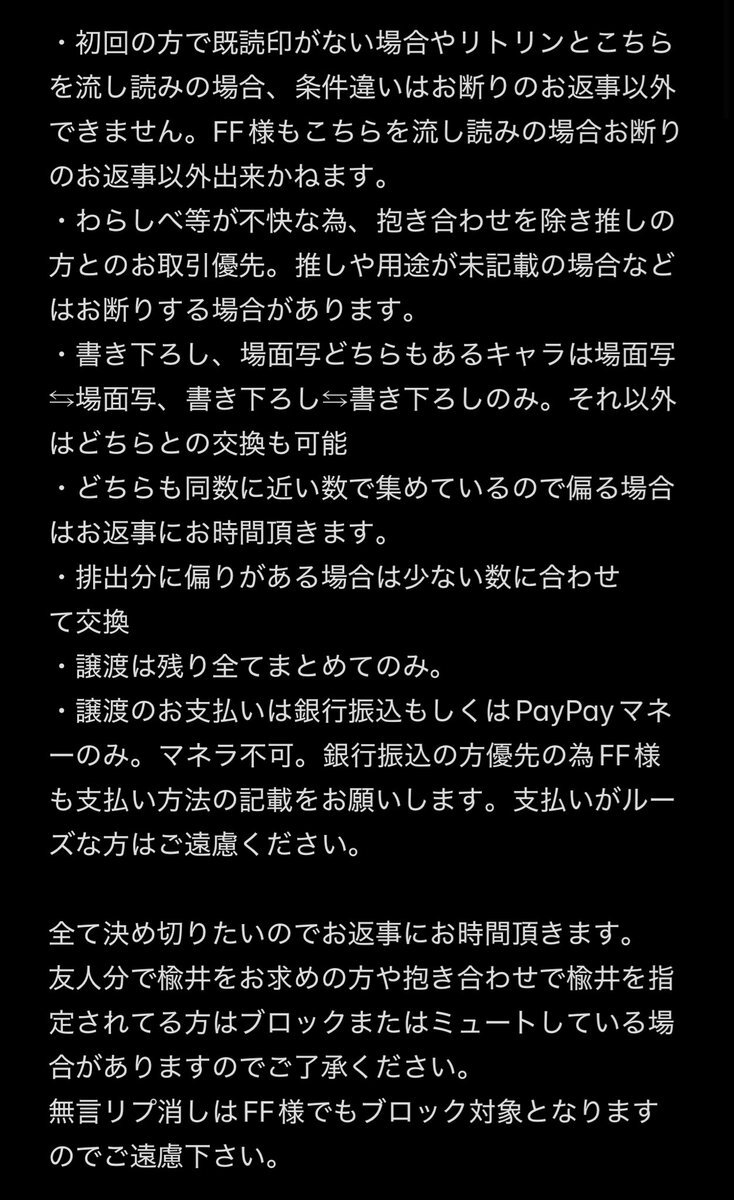 返信先:@kurotsuru_910初めまして、こんばんは🌙*゚ お声掛け、並びにリトリンのご確認ありがとうございます。 楡井さんのお譲り先が決まったため、楡井さんの交換が難しいです🙇🏻‍♀️また、抱き合わせ分調整させていただきく、桃瀬9⇄棪堂さん3,焚石さん3,柊さん3の交換は可能でしょうか? 御検討よろしくお願いいたします。