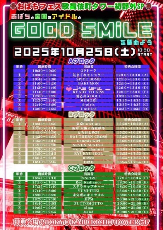 𓂃.*・゚ꫂ ၴႅၴ 10/25 schedule 🗓⟡.· ① ルナアムールメンバーとして初対バン🎀♡ #おばちフェス at歌舞伎町タワー ライブ11:20-11:40 特典会12:10-13:10 🎫A最前エリア ticketdive.com/event/obachife… 🎫優先エリア ticketdive.com/event/obachife… 🎁入場特典 10秒動画撮影or10秒撮影会券 pic.x.com/SOk5x0mKBr