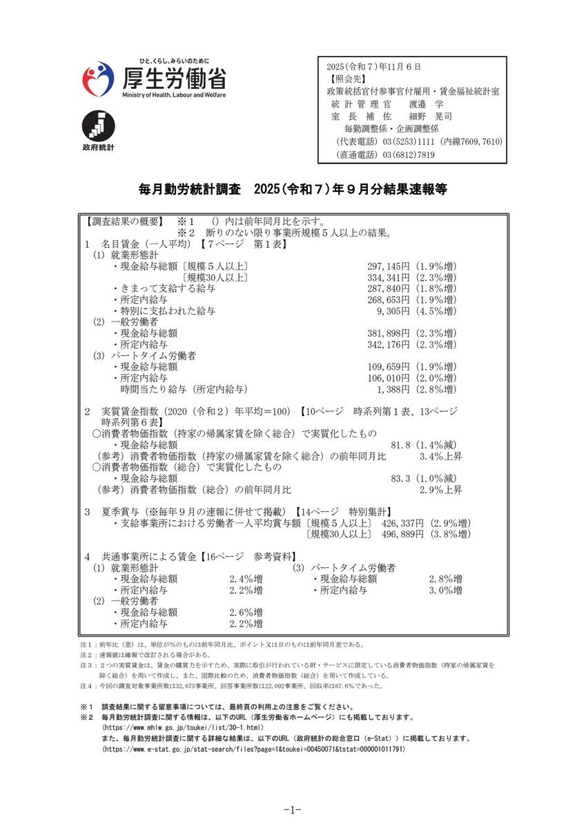 日経新聞 >厚労省が6日発表した9月の毎月勤労統計調査(速報、従業員5人以上)によると、 >名目賃金を示す1人あたりの現金給与総額は29万7145円と(前年同月比)1.9%増えた。 >基本給にあたる所定内給与は26万8653円で(同)1.9%伸びた。 >2025年の春季労使交渉は2年連続で高水準の賃上げにつながった。