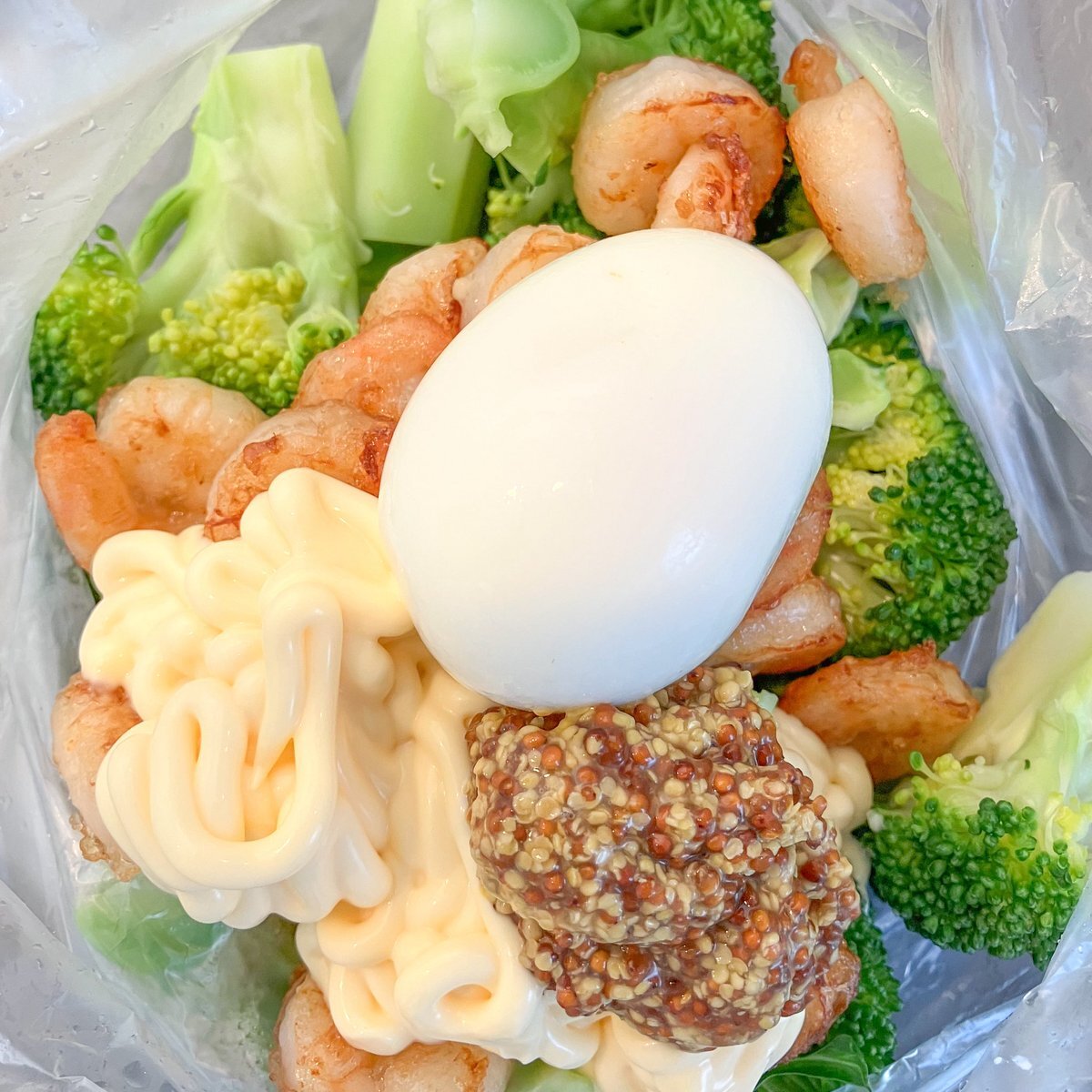 ブロッコリー1個を切り、アイラップで600W2分30秒加熱。エビ100g(塩小1/2、片栗粉大1まぶして揚げ焼き)ゆで卵1個、マヨネーズ大3、マスタード大1、黒胡椒を加え、袋の上から卵を半分に割り、ふって和えると美味しく仕上がります