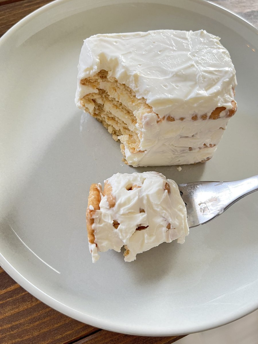 ちょっと休憩 ココナッツサブレ(ビスケット)に水切りヨーグルト挟んで一晩置いたらレアチーズケーキになるというやつ…… (­­ •ω•)ウーン… 遠くでレアチーズケーキっぽい違う何かだな レモン入れた方がいいかもしれない pic.x.com/0Jg9OZqgo1