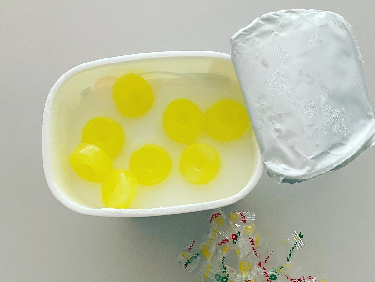 爽やかな季節になりましたので、今年も「パインアメ」と「無糖ヨーグルト」だけで作る超美味ヨーグルトをツイートしま( ´◎`)スー ①パインアメ8粒を無糖ヨーグルト1パックに入れて混ぜる ②冷蔵庫で1日放置     \以上/ めっちゃおいしいのでぜひ試してみてくだパイン!