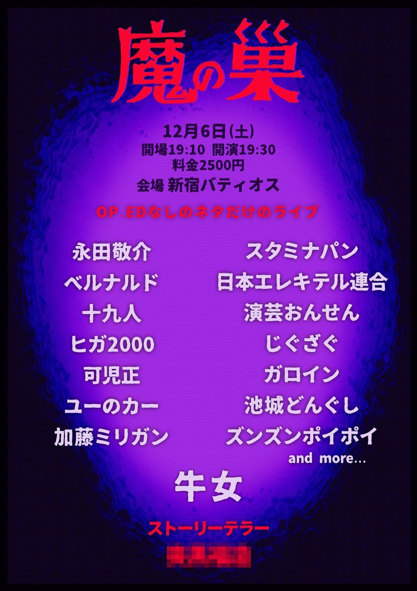 🪺残りわずか!🪺 『魔の巣』 🗓12月6日(土) ⏰開場19:10 開演19:30 🏢新宿バティオス 💰料金2,500円 🎫予約 tiget.net/events/442490 👤 トリ: 牛女 永田敬介 スタミナパン ベルナルド 日本エレキテル連合 十九人 演芸おんせん じぐざぐ ヒガ2000 可児正 ガロイン 池城どんぐし ユーのカー pic.x.com/5lS99neV9X