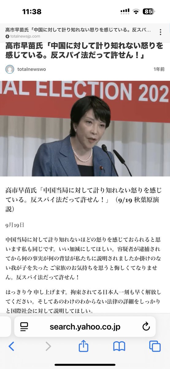 返信先:@Appraiser008口の動きから分かる様に、前半と後半が別の音声を同じ映像に被せた物です。 深圳日本人学校の児童惨殺事件について、中国当局からまともな説明がなかった事への抗議です。 前半 2024年9月19日秋葉原 「中国当局に対して、計り知れないほどの怒りを感じられると思います。 私も同じです。」 pic.x.com/ZpzCyQBOpy