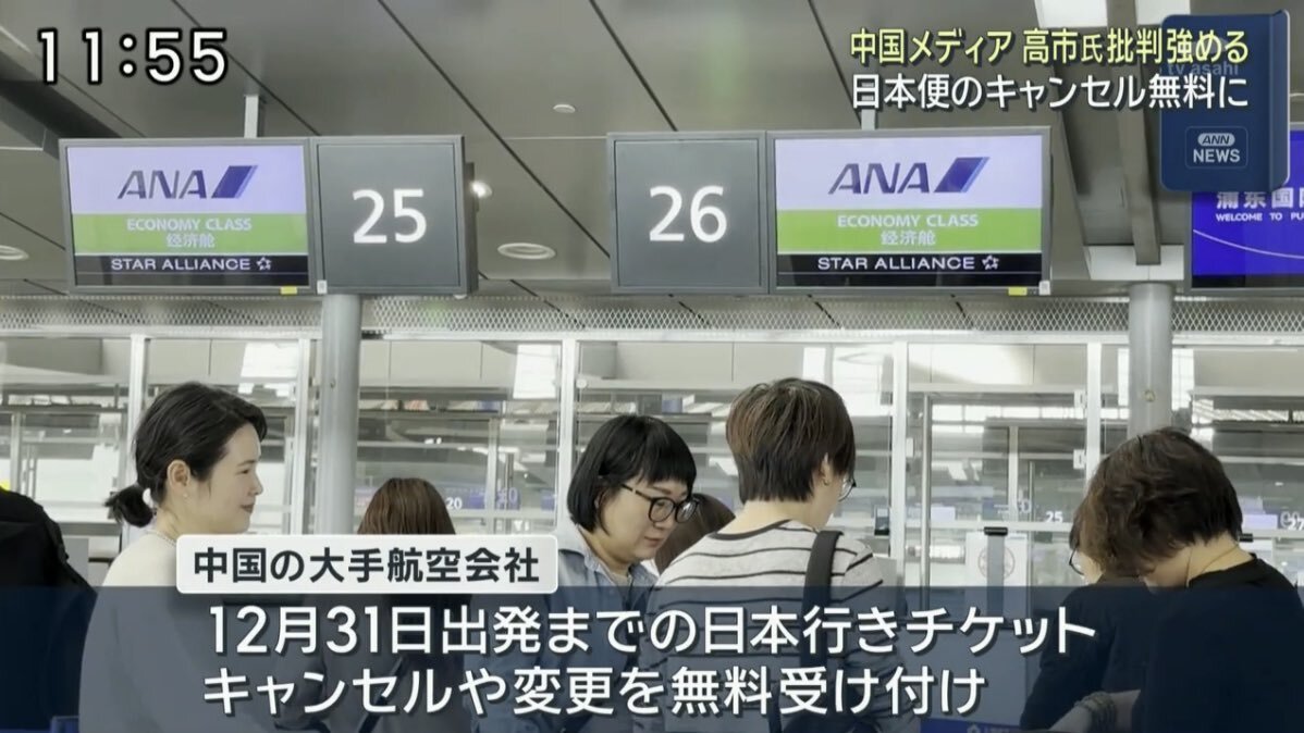 【観光で打撃を与える!】中国航空大手3社は、中国外交部が日本への渡航自粛を呼びかけたことに対応し、12月31日までに出発する日本行き航空券のキャンセルを無料で対応。中国は、日本の観光業界などに打撃を与えることで、日本政府に圧力をかける狙い。 pic.x.com/8gDchgcDZd
