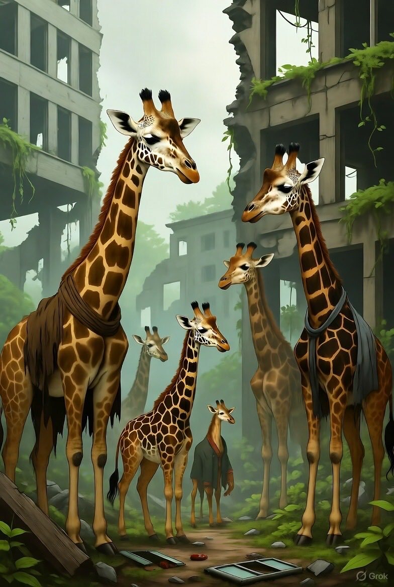 【AI無駄使い3】 さらに人類が滅亡した後の地球でキリンが文明を築いている様子を絵に描いてもらった❗️ さすがだ。。 pic.x.com/oWOPf4sQDW