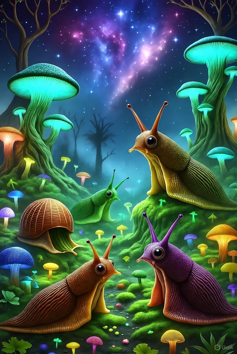 【AI無駄使い】 人類が滅亡した後の地球でナメクジが文明を築く様子をGrokで絵にしてもらった❗️ かわいい🩷 pic.x.com/lLpqnZsqQz