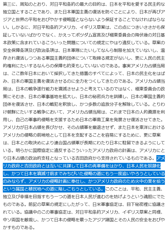 「アメリカ政府と吉田政府とは互いに共謀して日本の再軍備をはかり日本人民を奴隷化し、かつて日本を潰滅寸前までみちびいた侵略の道にもう一度追いやろうとしているのみならず、アメリカの侵略計画に奉仕し、かつアメリカ政府のため火中の栗を拾うという属国と植民地への道に陥しこもうとしている」 pic.x.com/Pil509iCxh x.com/steco_shimizu/…