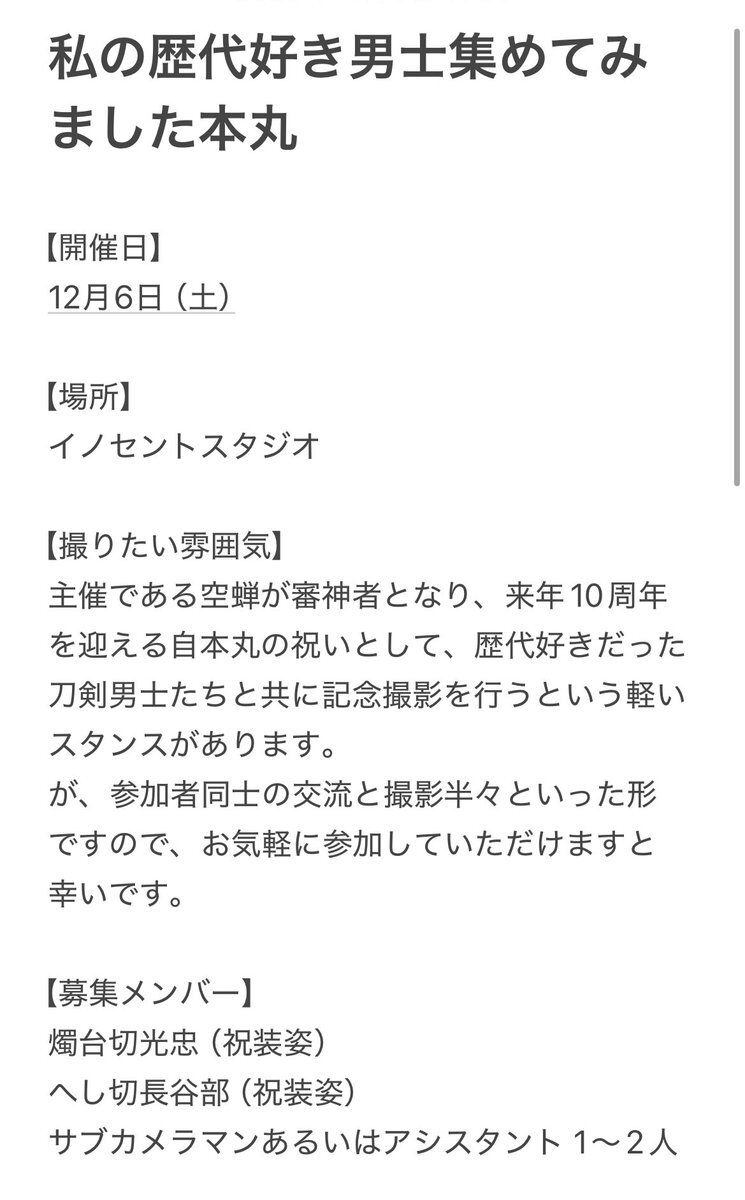 空蝉主催の本丸開催にあたって欠員が出ましたのでメンバーを募集致します!添付画像をよくお読みの上、レイヤー様、カメラマン様共にDM、リプにてお声かけお願いいたします。また、レイヤー、カメラマン共に主催FF>メンバーFFとなります!!何卒よろしくお願いします🙏😭🙇♀️