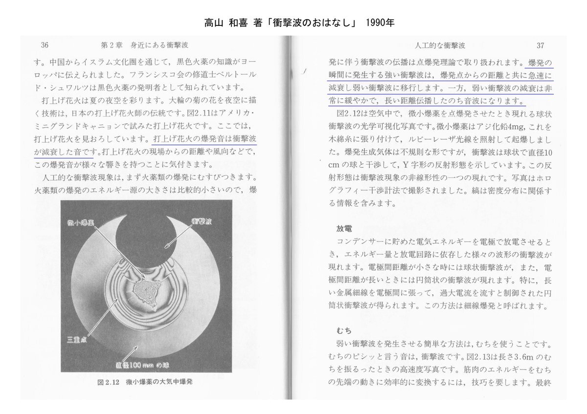 高山和喜著「衝撃波のおはなし」1990年 P37 「爆発の瞬間に発生する強い衝撃波は、爆発点からの距離と共に急激に減衰し、弱い衝撃波に移行します。弱い衝撃波の減衰は非常に緩やかで、長い距離伝播したのち音波になります。」 pic.x.com/RvUAS4EZOX