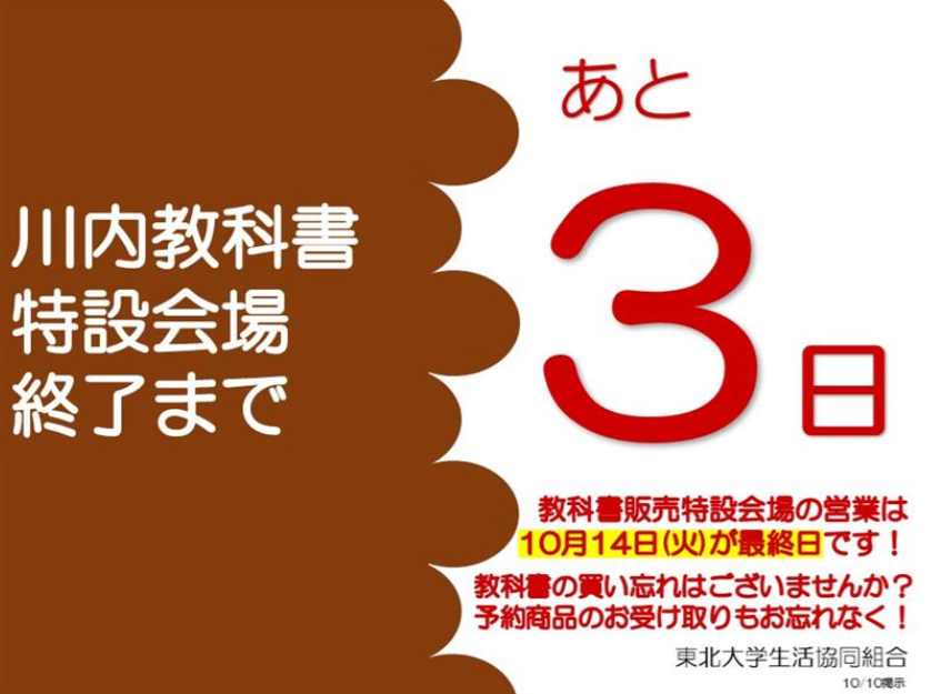 【全学教育/文系学部 教科書特設会場からのご案内】 特設会場の営業は10/14(火)で終了です! お早目の購入、予約商品のお受け取りにご協力をお願いいたします。平日8:30~18:30で営業中です。 特設会場終了後の予約商品のお受け取りは川内購買店カウンターへおこしください。 pic.x.com/5Goml50ayU