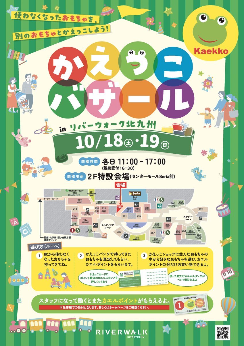 「かえっこバザール」開催!🐸 もってきたおもちゃを査定してもらって『かえるポイント』🐸✨をためて、お友達が持ってきたおもちゃの中から欲しいものを選んで『かえっこ』しよう! ■日時:10/18(土)・19(日) ■場所:2F 特設会場(センターモールSeria前) ★詳しくはこちら riverwalk.co.jp/event/kaekko_b… pic.x.com/gN33RaxnBu