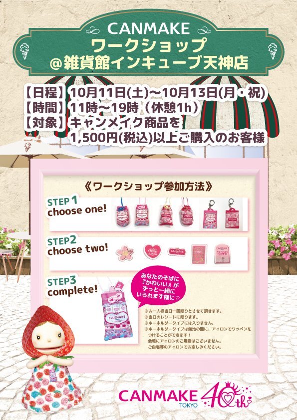 / 💗キャンメイク40thPOPUP STORE💗 ワークショップ開催 \ 🔸会場🔸 雑貨館インキューブ天神店 3F特設会場 🔸会期・時間🔸 10月11日㈯~10月13日(月・祝) くわしくはこちら👇 incubenews.com/event/archives… 皆さまのご来店をお待ちしています💗 pic.x.com/S7rW96KVLR x.com/CanmakeTokyo/s…
