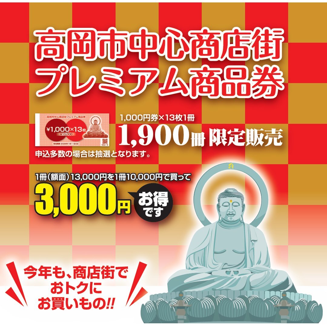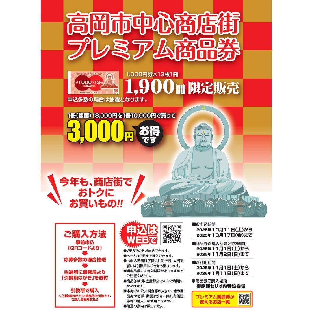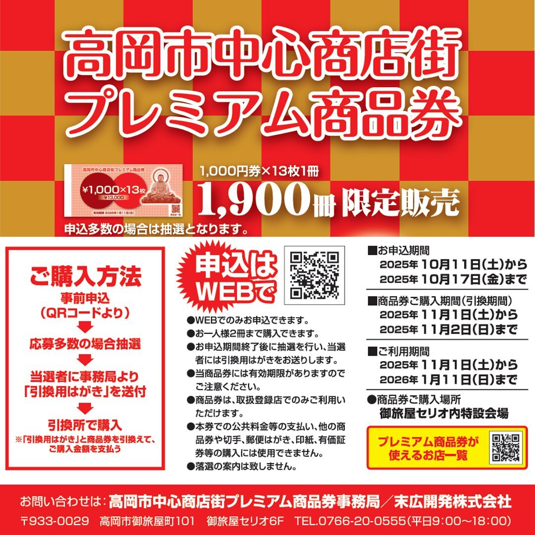 高岡市中心商店街 プレミアム商品券 お申込期間 10月11日(土)~10月17(金) 購入期間 11月1日(土)~11月2日(日) 購入場所 御旅屋セリオ内特設会場 商品券理由期間 11月1日(土)~2026年1月11日(日) pic.x.com/9AxHTSuPvX