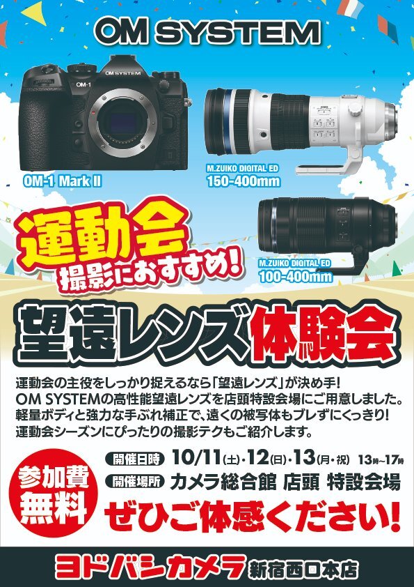 【望遠レンズ体験会開催📷】 今回は、OM SYSTEM「OM-1 MarkII」に 合わせて使える同社の高性能望遠レンズを ご用意いたします💁 運動会シーズンにピッタリな一品を ぜひご体感ください‼️ 🗓️10/11(土)~13(月・祝)13~17時 📍カメラ総合館 店頭特設会場 ➡️yodobashi.com/category/19055…+ pic.x.com/mUkc1mhgTu