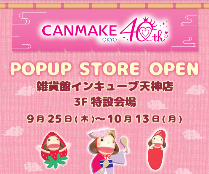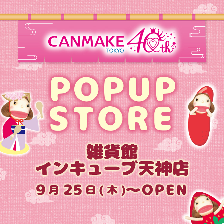 / 💗キャンメイク 40thPOPUP STORE💗 \ 🔸会場🔸 雑貨館インキューブ天神店 3F特設会場 🔸会期・時間🔸 9月25日㈭~10月13日㈪ くわしくはこちら👇 incubenews.com/event/archives… お買い上げプレゼントなど、楽しい企画をご用意して 皆さまのご来店をお待ちしています💗
